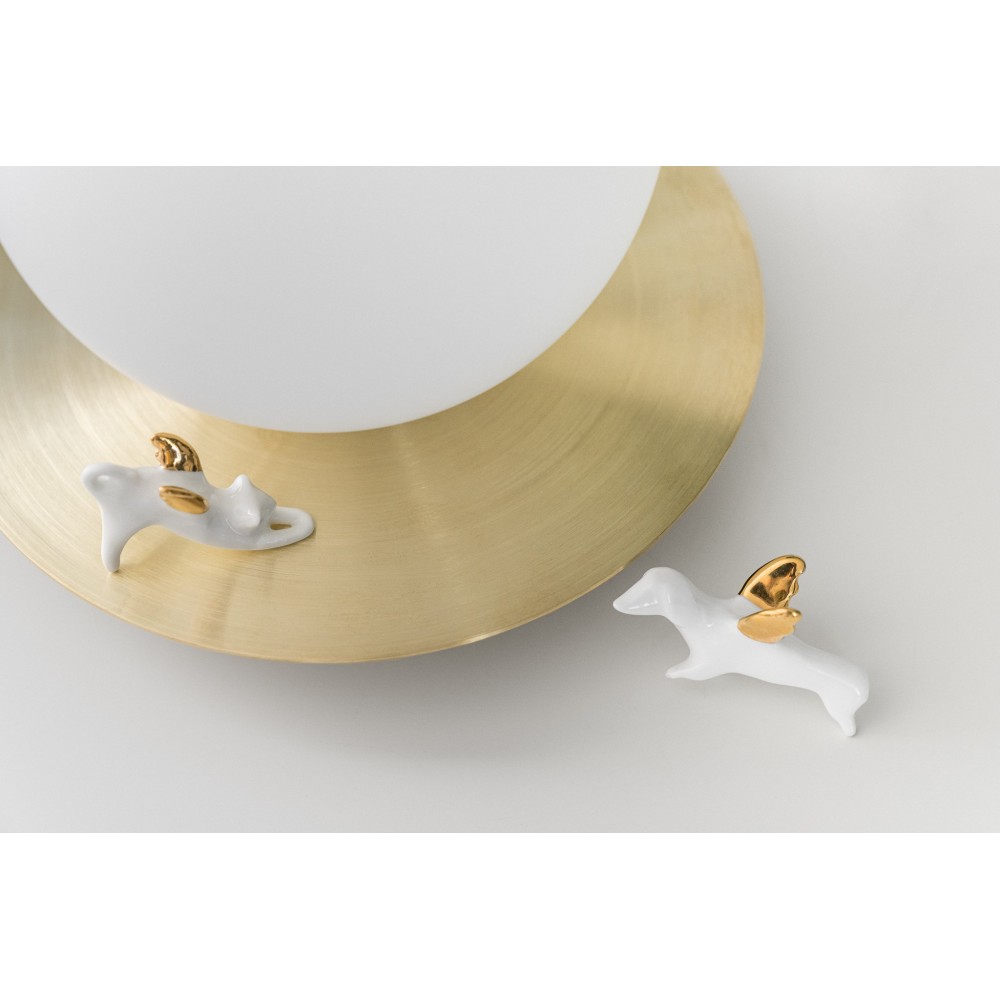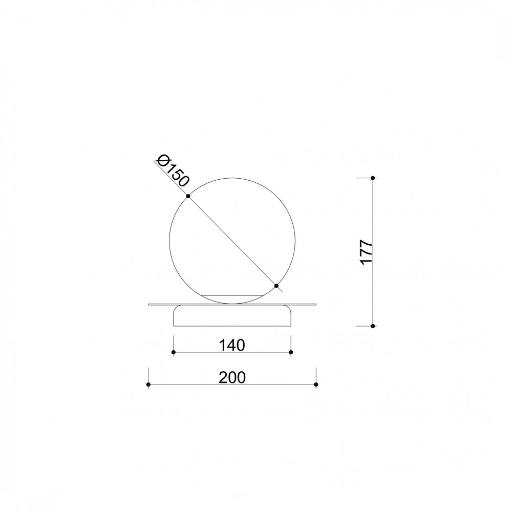 L'abat-jour sphérique blanc laiteux d'un diamètre de 15 cm repose sur un disque en laiton laqué brossé, qui reflète délicatement la lumière et confère à la lampe un caractère élégant et luxueux. L'ensemble est couronné par un socle bas noir à la finition structurée, qui ajoute une légèreté graphique à la lampe.