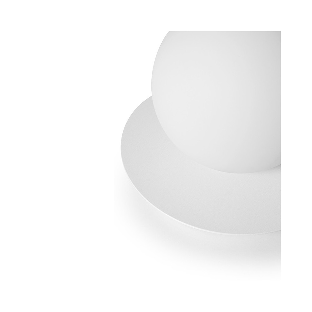 L'abat-jour sphérique blanc laiteux d'un diamètre de 15 cm repose sur un disque en métal peint par poudrage, qui reflète délicatement la lumière et confère à la lampe un caractère élégant et luxueux. L'ensemble est couronné par un socle bas à la finition structurée, qui apporte une légèreté graphique à la lampe.