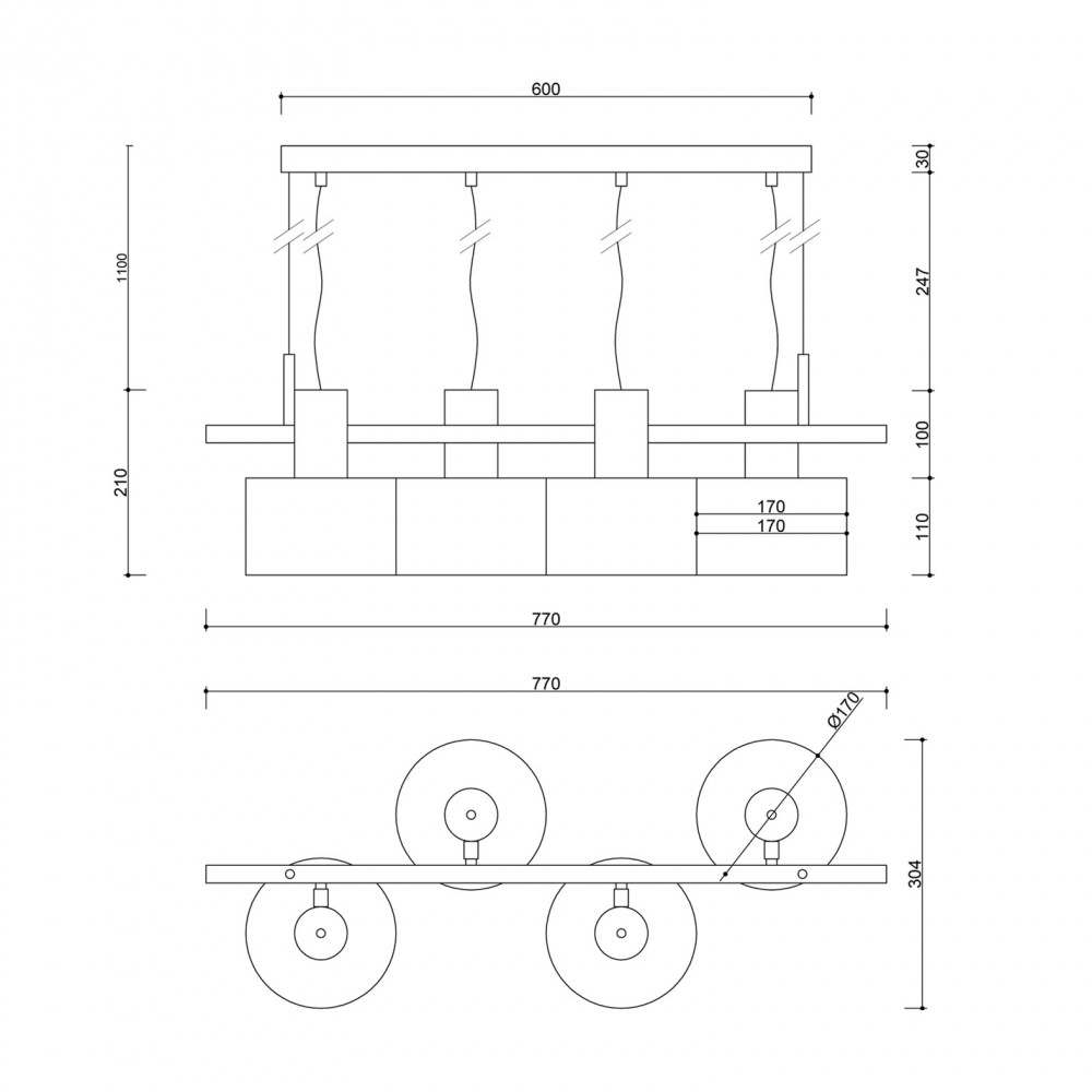 L'ensemble est soutenu par une barre de plafond de 60 cm de long, qui organise visuellement la composition et donne à la lampe un rythme harmonieux. La longueur totale de la lampe est de 131 cm maximum - grâce aux pendentifs réglables, il est facile de l'adapter à la hauteur de la pièce et à l'effet d'éclairage souhaité.
