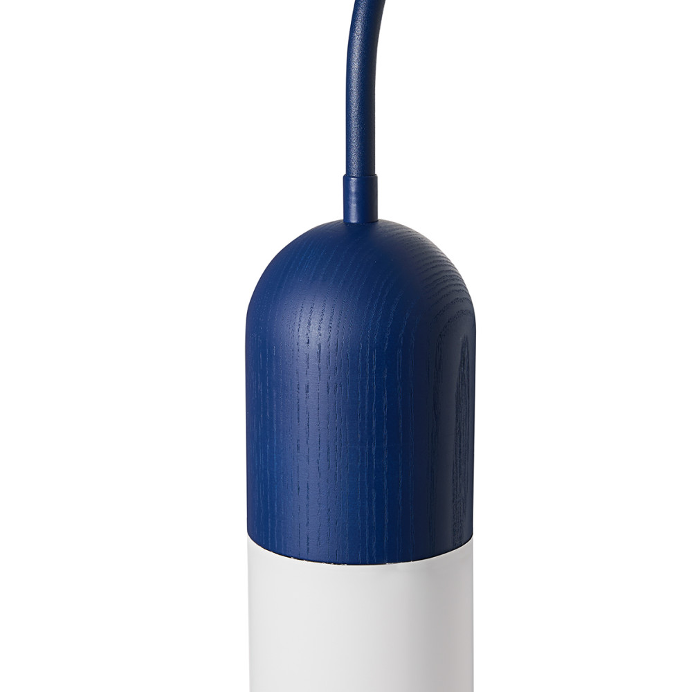L'applique est composée de trois matériaux différents : des éléments métalliques peints avec une peinture à texture fine en bleu marine RAL 5003, blanc RAL 9003 et noir RAL 9005, du verre laiteux qui diffuse la lumière de manière subtile et agréable et du bois de frêne naturel. Cette combinaison soigneusement étudiée de textures et de tons fait de FUNSUI W A un élément qui attire le regard sans perturber la cohérence de l'intérieur. L'ensemble est posé sur un socle métallique esthétique d'où part une tige élancée qui supporte l'abat-jour. La lampe mesure 17,7 x 8,4 x 50,6 cm.