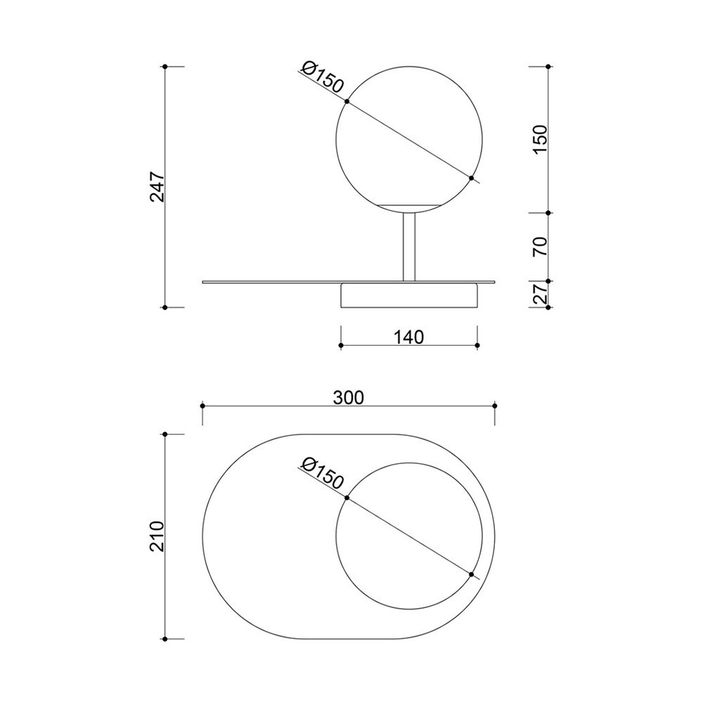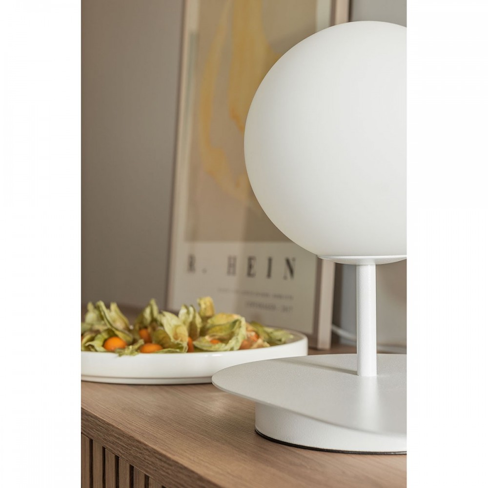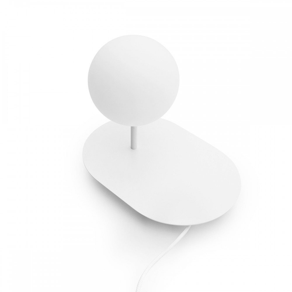 - lampe à poser avec étagère - métal / verre - blanc - hauteur 25cm - largeur 30cm - globe en verre blanc mat fi 15cm - base structurée blanche fi 14cm - étagère en métal blanc - 2 X 0.75mm2 câble bifilaire en tresse polyester blanche, 150cm de long - prise et interrupteur blancs - fil G9 - max 12W