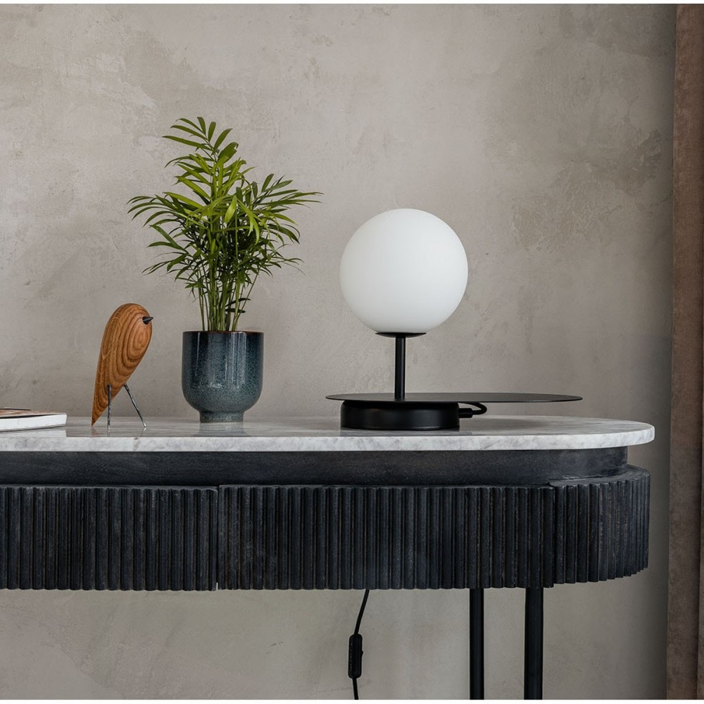 - lampe à poser avec étagère - métal / verre - noir - hauteur 25cm - largeur 30cm - diffuseur en verre blanc mat fi 15cm - base structurelle noire fi 14cm - étagère en métal noir - 2 X 0.75mm2 câble tressé en polyester noir 150cm de long - prise et interrupteur noirs - filetage G9 - max 12W.