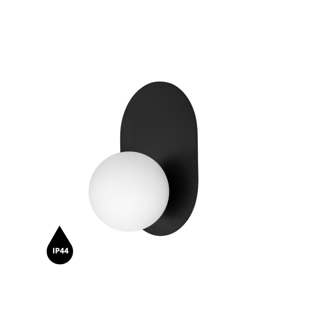- applique murale / support mural - métal / verre - noir / blanc - hauteur 30cm - largeur 21cm - profondeur 18cm - diffuseur en verre de 15cm de diamètre en blanc mat - support mural peint en noir structurel - câble bifilaire 2 X 0.75mm2 - filetage G9 - max 12W - IP44