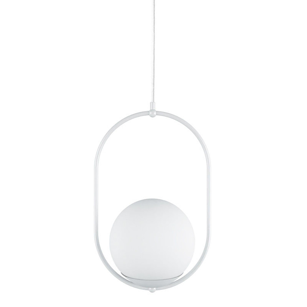 La lampe est équipée d'un câble tressé en polyester noir de 100 cm de long et d'une grille de plafond ronde en métal. Sa hauteur totale est de 150 cm, et le luminaire lui-même mesure 40 cm de long et 28 cm de large. Le diffuseur est en verre blanc d'un diamètre de 20 cm. A l'intérieur se trouve un support pour une source lumineuse de type E27 (LED, maximum 15W), ce qui permet à l'utilisateur de choisir l'intensité et la température de couleur en fonction des besoins de l'espace.