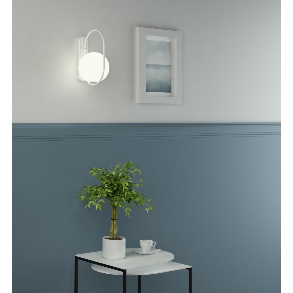 KOBAN D est une applique de la collection KOBAN qui allie la fonctionnalité d'une applique à une forme épurée et minimaliste. Son design repose sur la juxtaposition simple et graphique d'un cadre métallique et d'un abat-jour sphérique en verre blanc laiteux d'un diamètre de 15 cm. Le verre mat diffuse subtilement la lumière, offrant un éclairage agréable et non éblouissant.