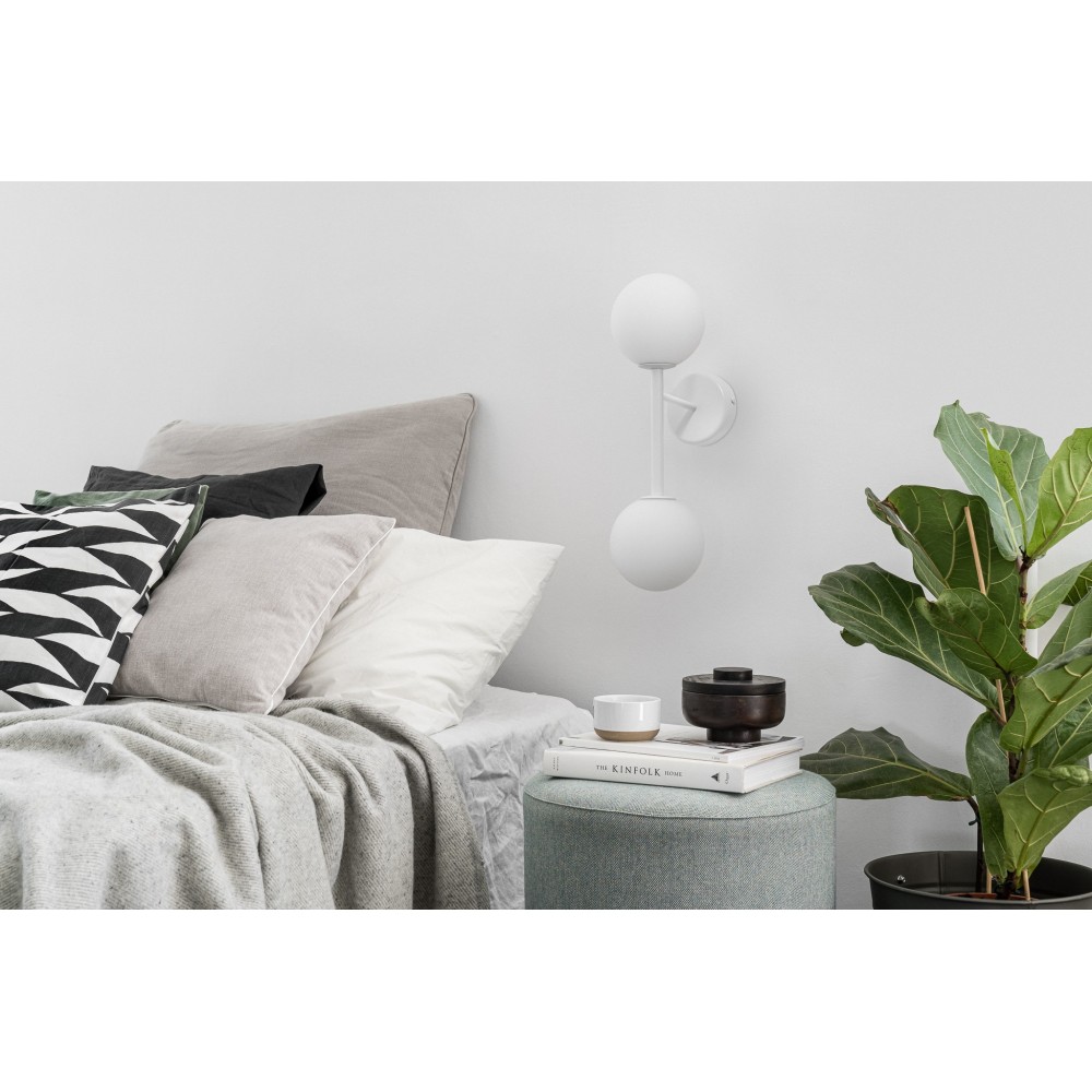 Kop B est une élégante applique murale qui reprend l'idée du modèle Kop A - cette fois avec deux abat-jour sphériques blanc laiteux d'un diamètre de 15 cm. Leur disposition de part et d'autre du tube métallique vertical crée une composition lumineuse équilibrée mais dynamique, rappelant un système planétaire en mouvement. La lampe attire l'attention par la subtilité de sa forme et sa légèreté graphique, s'intégrant parfaitement dans les intérieurs modernes, minimalistes et intemporels.