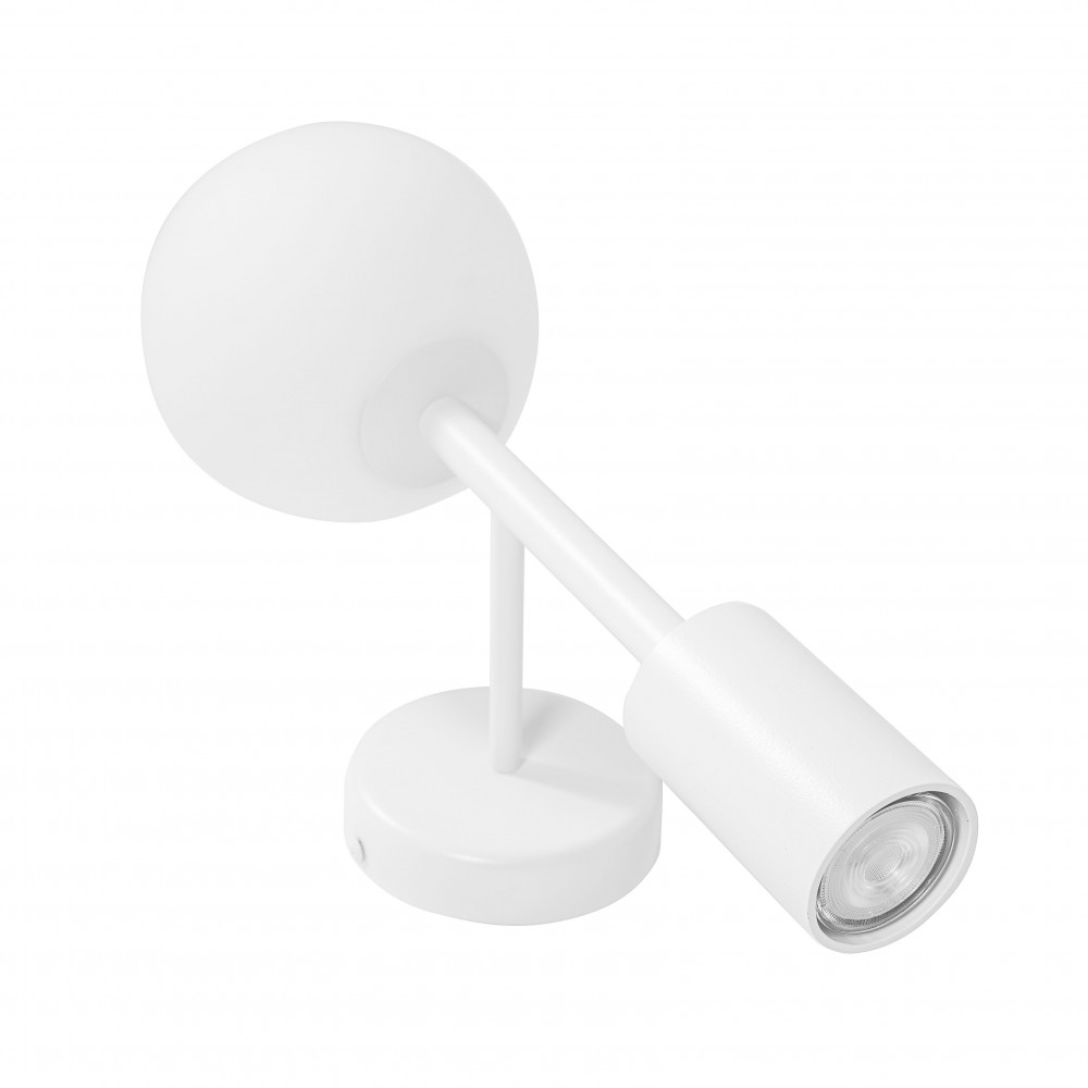 La partie supérieure de la lampe est constituée d'un abat-jour sphérique en verre blanc laiteux d'un diamètre de 15 cm, qui diffuse uniformément la lumière pour créer une atmosphère chaleureuse. En dessous se trouve un spot métallique, de la couleur de la lampe, d'un diamètre de 6 cm - un élément fixe et inamovible avec une lumière directionnelle. Bien que le spot ne soit pas orientable, son positionnement assure un éclairage ponctuel de la zone sélectionnée de manière équilibrée et fonctionnelle.