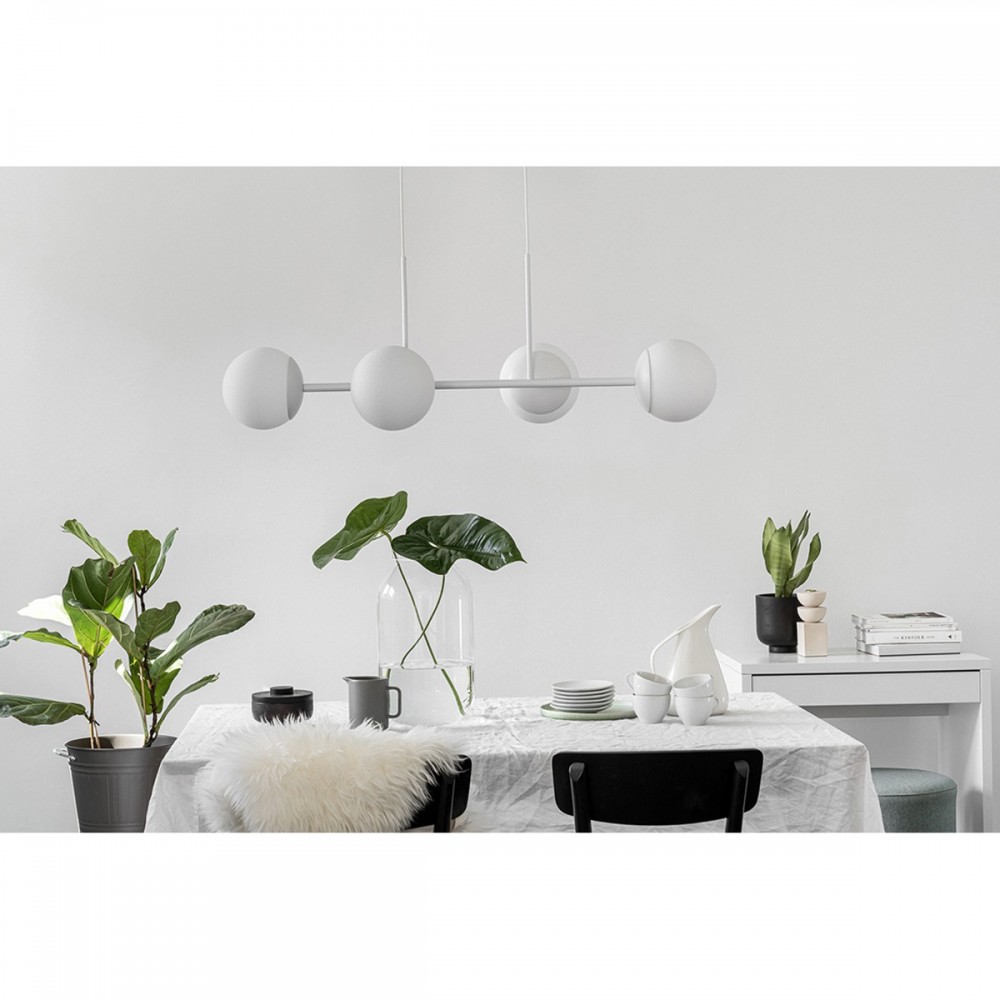 - plafonnier, lampe suspendue - blanc (Signal White RAL 9003) - matériau métal, verre - longueur 120cm - largeur 42cm - hauteur 41,3cm - longueur totale 160cm - quatre abat-jour en verre blanc laiteux ⌀20cm - support structurel laqué blanc - 2x câble tressé en polyester blanc 116cm - fil E27 - max 4x15W LED - IP20