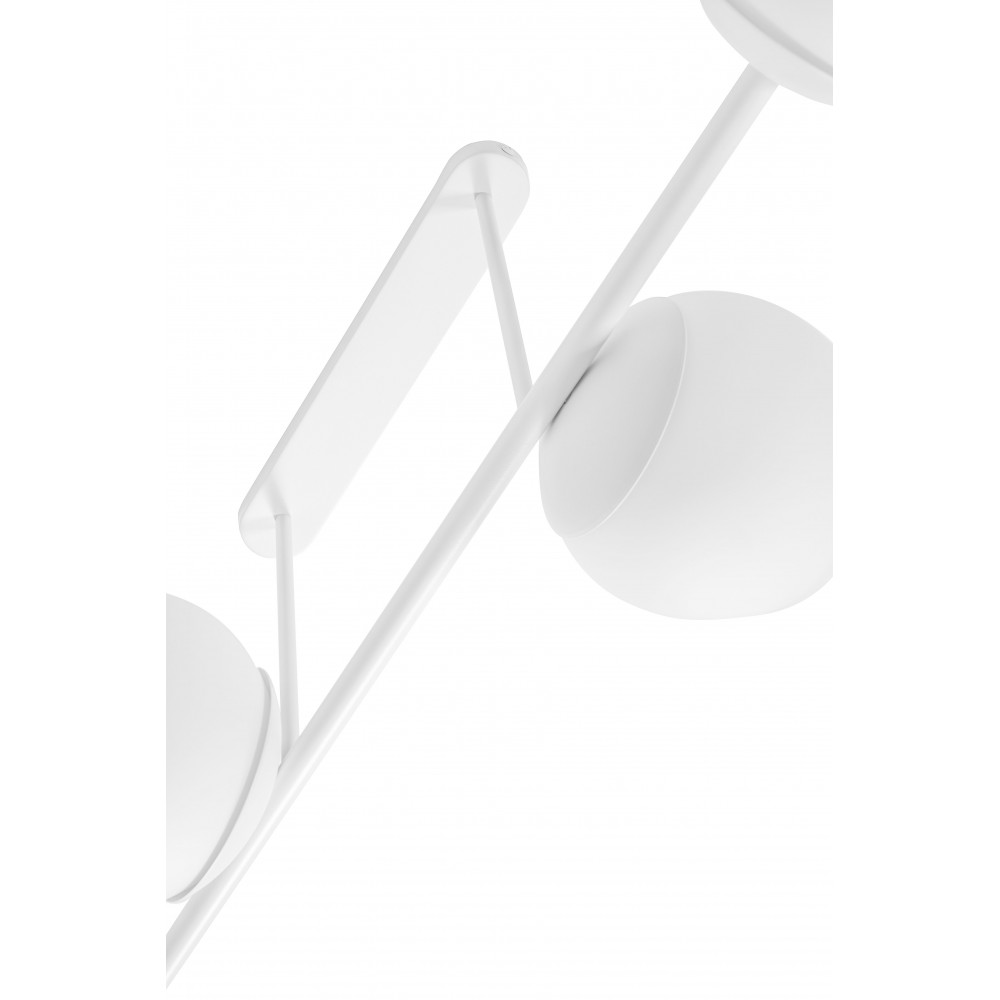 Le plafond KOP D se compose de quatre abat-jours d'un diamètre de 20 cm, en verre blanc laiteux qui diffuse la lumière de manière uniforme et directe. Les abat-jour sont disposés symétriquement sur l'axe horizontal de la structure, fixés au plafond par deux étriers élancés et une base peinte en noir (Jet Black RAL 9005) ou en blanc (RAL 9003).