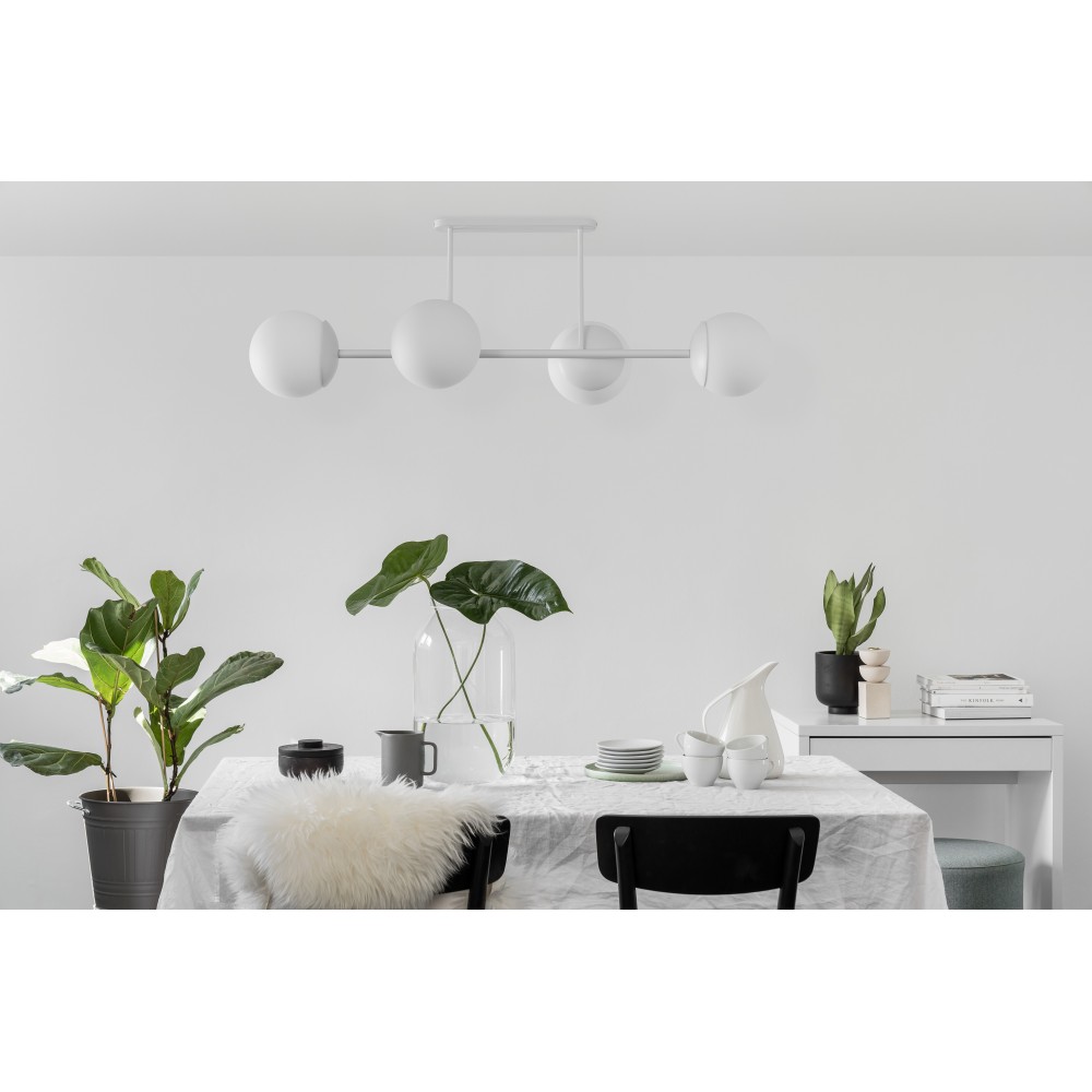 - plafonnier, plafond - couleur blanc (Signal White RAL 9003) - matériau métal, verre - longueur 120cm - largeur 42cm - hauteur 42,3cm - quatre abat-jour en verre blanc laiteux ⌀20cm - support structurel laqué blanc - filetage E27 - max 4x15W LED - IP44