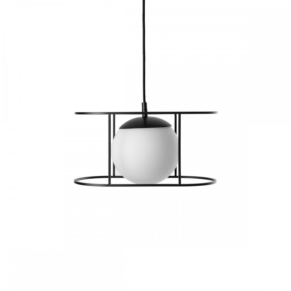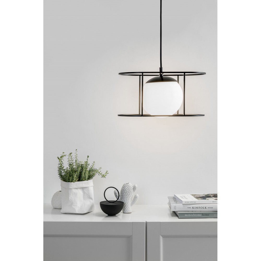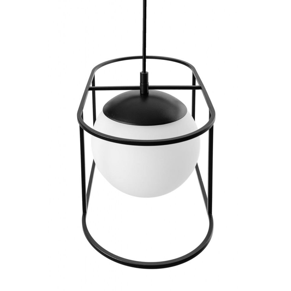 - lampe à fixer au plafond - longueur 123 cm - diffuseur en verre blanc mat - cadre métallique et cadre de plafond laqué en noir structurel - tresse en coton noir - câble à 2 fils 2 X 0.75mm2 - max 15W