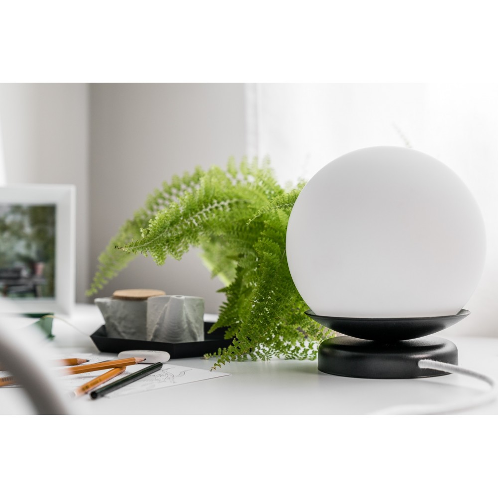 La lampe KUUL ST se compose d'un abat-jour sphérique d'un diamètre de 20 cm en verre blanc laiteux, qui garantit une lumière douce et homogène, idéale pour la détente en soirée, la lecture ou le travail de bureau.