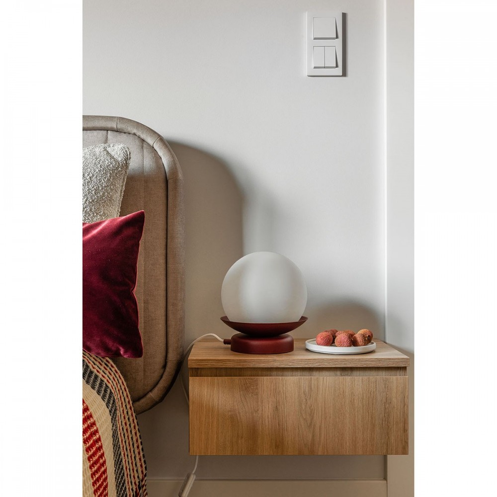 - lampe à poser - couleur bordeaux (Purple Red RAL 3004) - matériau métal, verre - longueur 20 cm - largeur 20 cm - hauteur 22,5 cm - diffuseur en verre blanc laiteux ⌀20 cm - base peinte en bordeaux structurel - cordon tressé en polyester blanc 150 cm - fiche et interrupteur blancs - filetage E27 - max 15W LED - IP20