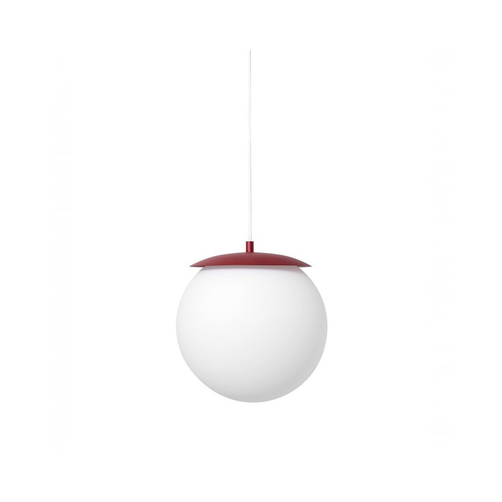 - plafonnier, lampe suspendue - couleur bordeaux (Purple Red RAL 3004) - matériau métal, verre - longueur 30cm - largeur 30cm - hauteur 30cm - longueur totale 130cm - diffuseur en verre blanc laiteux ⌀30cm - support laqué en bordeaux structurel - câble en polyester blanc tressé 97,5cm - filetage E27 - max 15W LED - IP20