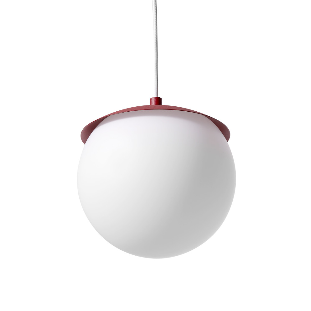 - plafonnier, lampe suspendue - couleur bordeaux (Purple Red RAL 9003) - matériau métal, verre - longueur 20cm - largeur 20cm - hauteur 20cm - longueur totale 135cm - diffuseur en verre blanc laiteux ⌀20cm - support laqué en bordeaux structurel - câble en polyester blanc tressé 112,5cm - filetage E27 - max 15W LED - IP20