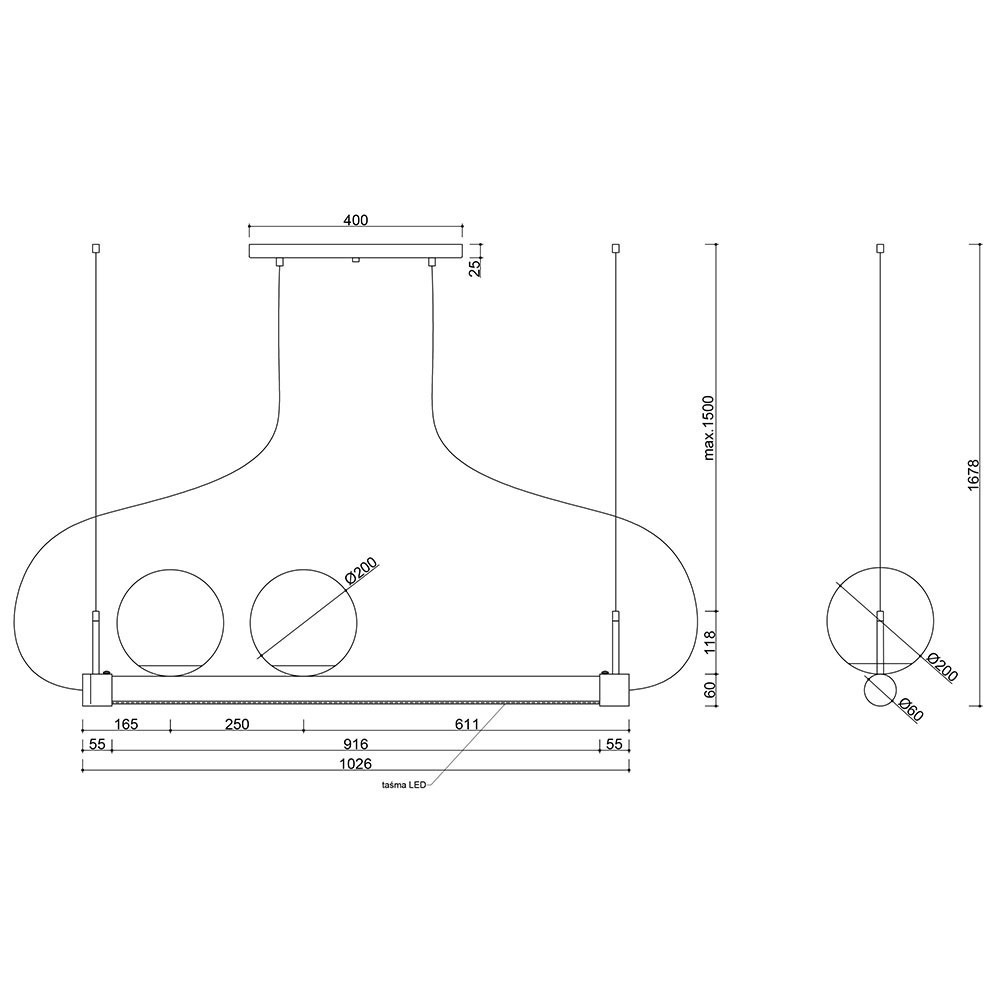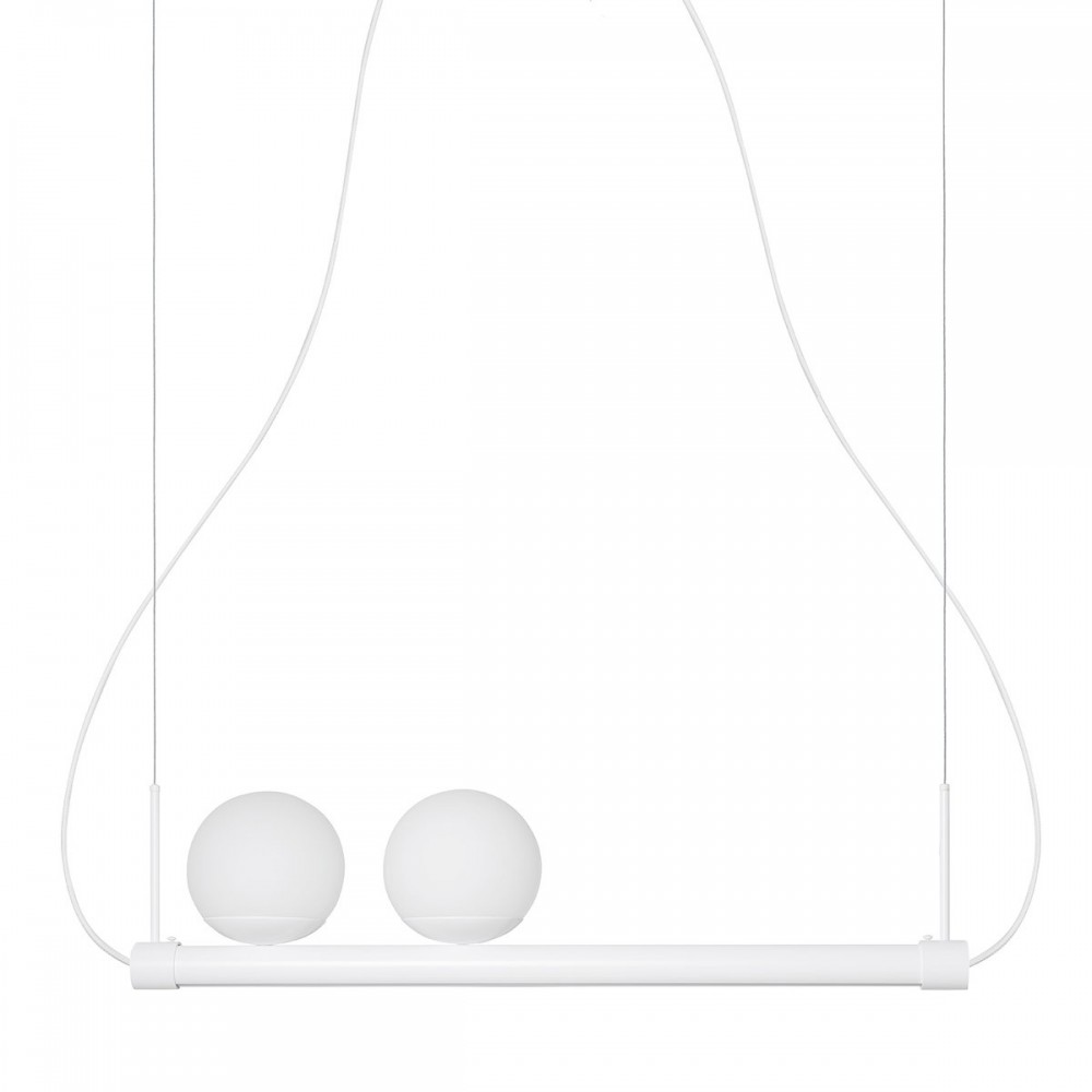 La lampe se compose d'un cadre horizontal en métal peint par poudrage sur lequel sont placés deux abat-jour sphériques en verre d'un diamètre de 20 cm. Une bande LED (25W, 3000K) est intégrée dans la partie inférieure du cadre pour fournir une source de lumière supplémentaire. L'éclairage LED peut être personnalisé en une couleur neutre de 4000K sur demande. La lampe est également équipée de deux douilles pour ampoules E27 (max 2×15W LED). L'ensemble est suspendu à deux câbles en acier et à des fils tressés en textile.