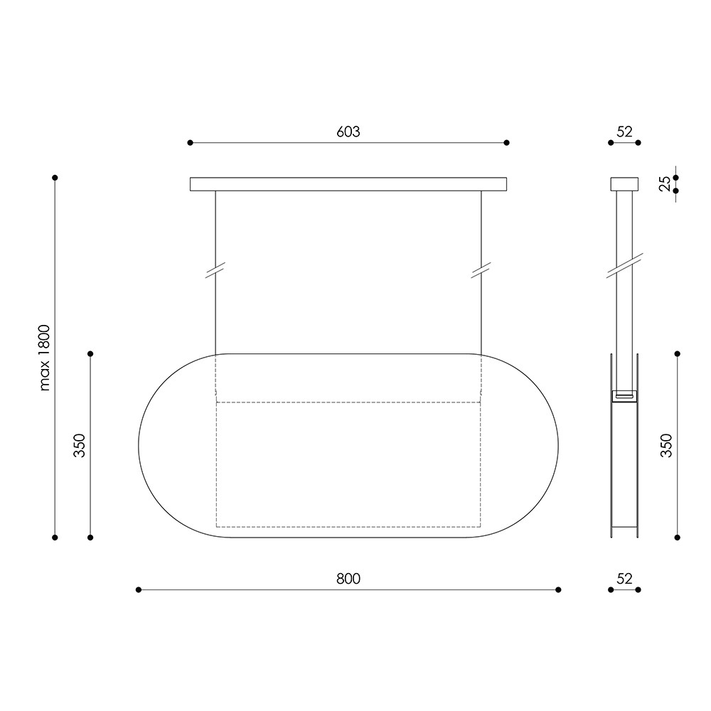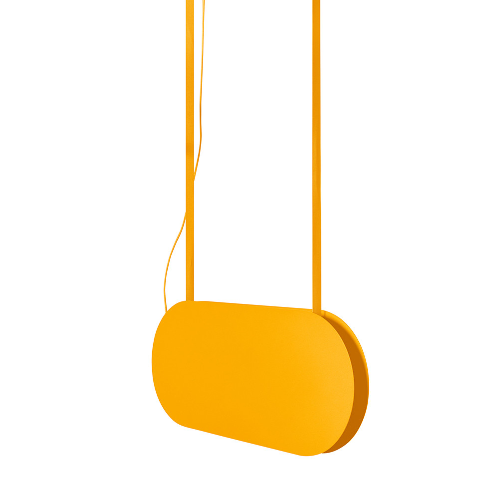La lampe est suspendue à une sangle textile de couleur assortie au corps, d'une longueur de 145 cm. Sa forme horizontale et ses proportions (80 x 5,2 x 35 cm) lui permettent de s'intégrer parfaitement au-dessus d'un îlot de cuisine, d'un bar ou d'une table, apportant non seulement de la lumière mais aussi du caractère à l'espace.