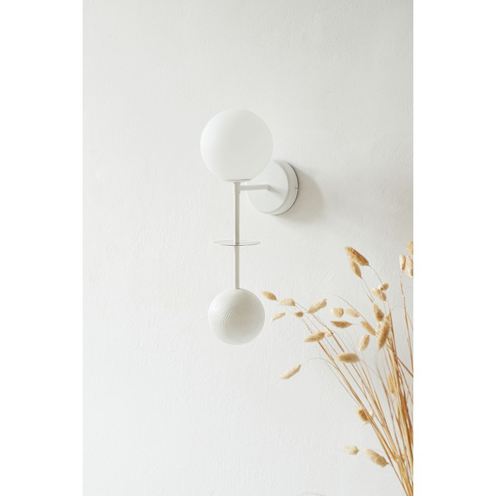 -applique mur ale- couleur blanc - matériau métal, bois, verre - hauteur 50cm - largeur 15cm - profondeur 22cm - diffuseur en verre blanc ⌀15cm - élément métallique ⌀10cm - globe en pierre de taille ⌀12cm - couvercle en métal blanc ⌀12cm - filetage G9 - max 12W - IP20