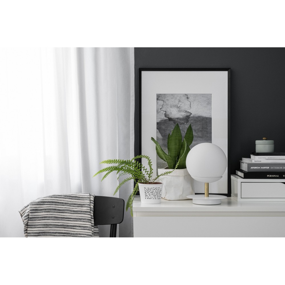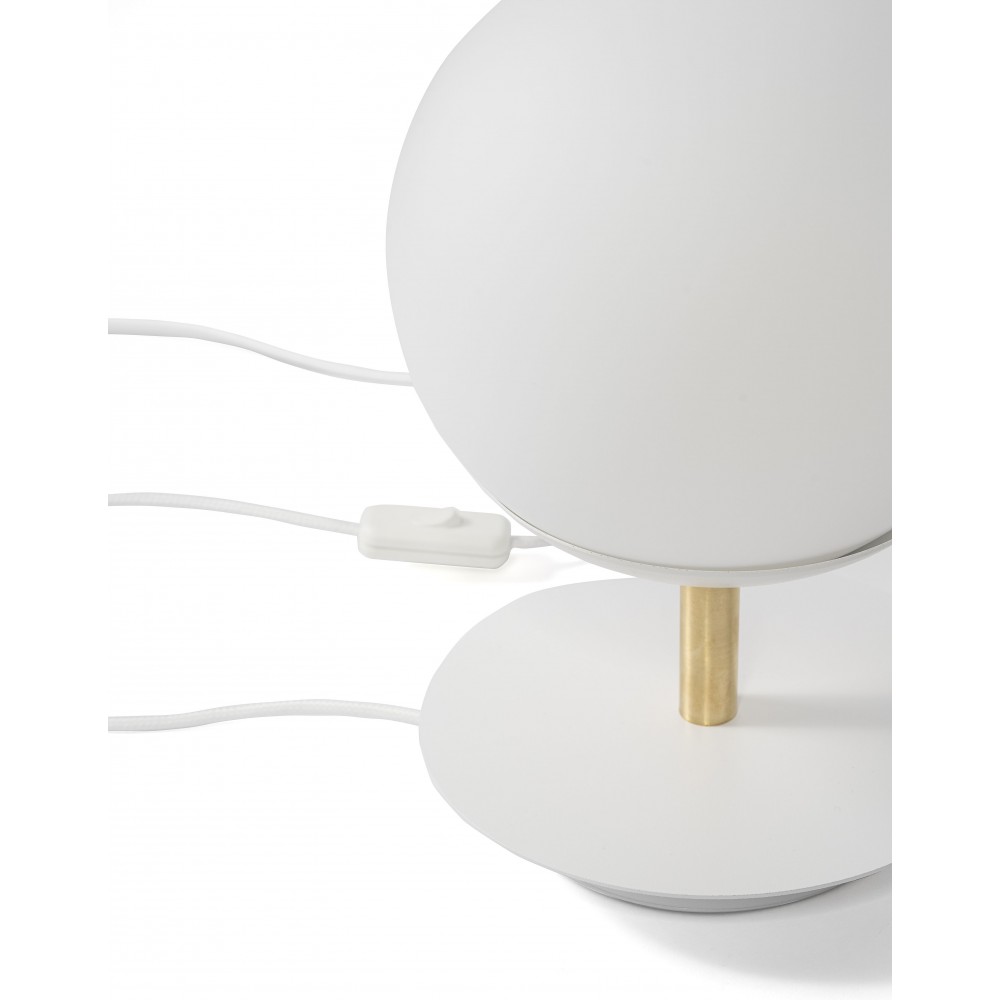 - lampe à poser - métal / laiton / verre - or / blanc - hauteur 27cm - diamètre 20cm - diffuseur en verre blanc dépoli fi 20cm - base structurelle blanche - disque en métal fi 20cm - 2 X 0.75mm2 câble tressé blanc 150cm de long - prise et interrupteur blancs - filetage E27 - max 15W