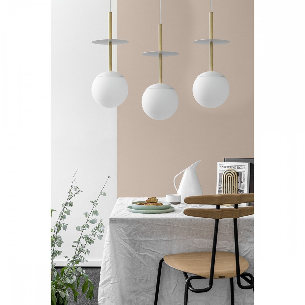 - plafonnier triple suspension - métal / verre - blanc - longueur 130cm - longueur du câble 70cm, 80cm, 70cm - diffuseur en verre blanc mat fi 20cm - barre de plafond structurelle laquée blanc 60cm - trois disques métalliques fi 20cm - câble bifilaire 2 X 0.75mm2 en tresse polyester blanche - filetage E27 - max 3x15W