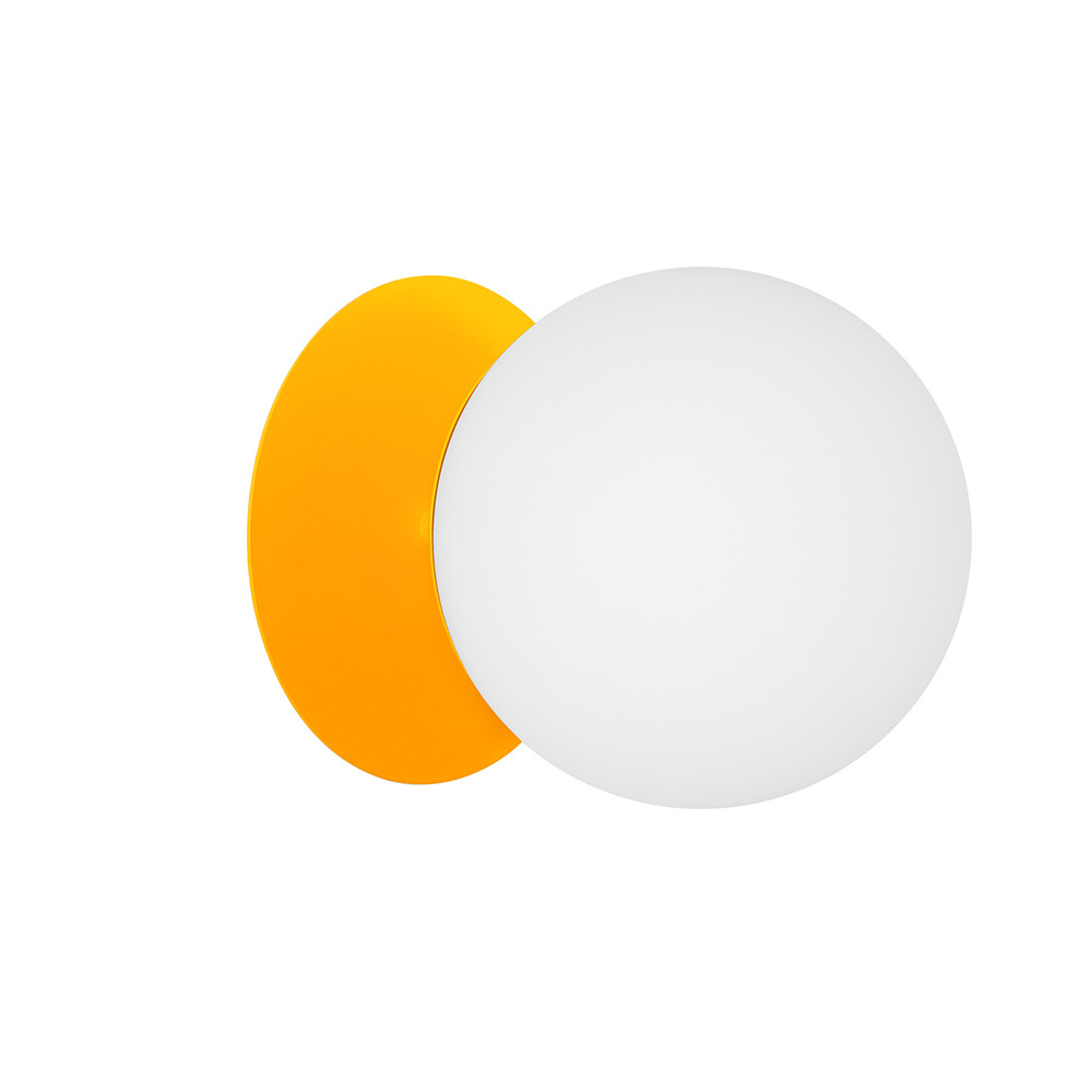 - applique murale, support mural, plafond - matériau métal, verre - couleur melon (Melon Yellow RAL 1028) - longueur 26,6cm - largeur 20cm - hauteur 20cm - abat-jour en verre blanc dépoli fi 20cm - support mural structurel laqué melon fi 14cm - disque en métal fi 20cm - câble bifilaire 2 X 0.75mm2 - filetage E27 - max 15W - IP20