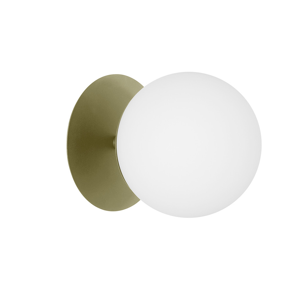 -lampe murale, applique murale, plafond - matériau métal, verre - couleur vert olive (Reed Green RAL 6013) - longueur 26,6cm - largeur 20cm - hauteur 20cm - diffuseur en verre blanc dépoli fi 20cm - support mural structurel laqué vert olive fi 14cm - disque en métal fi 20cm - câble bifilaire 2 X 0.75mm2 - filetage E27 - max 15W - IP20
