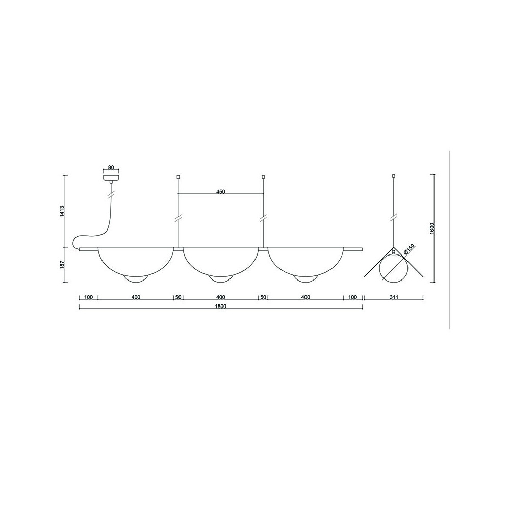 - plafonnier, lampe suspendue - blanc - matériau métal, verre - hauteur 160cm - largeur 150cm - profondeur 31cm - 3x abat-jour en verre blanc ⌀15cm - cadre métallique blanc - 2x fil d'acier...