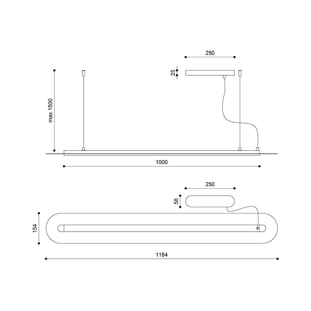 Le corps de la lampe est en métal dans les couleurs de la palette UMMO : blanc RAL 9003, noir RAL 9005, rouge-orange RAL 2002, olive RAL 6013, ce qui lui confère un caractère moderne et universel. La lampe est équipée d'une source lumineuse LED 24W intégrée, disponible en deux températures de couleur : 3000K ou 4000K. Cela permet d'adapter l'éclairage aux besoins et aux préférences de chacun. Les dimensions de la lampe sont les suivantes 118,4 x 15,4 x 5 cm. Elle est suspendue à de fins câbles d'acier, ce qui accentue encore son caractère léger et fin. La longueur totale de la suspension est de 150 cm, ce qui permet de l'utiliser dans différents espaces.