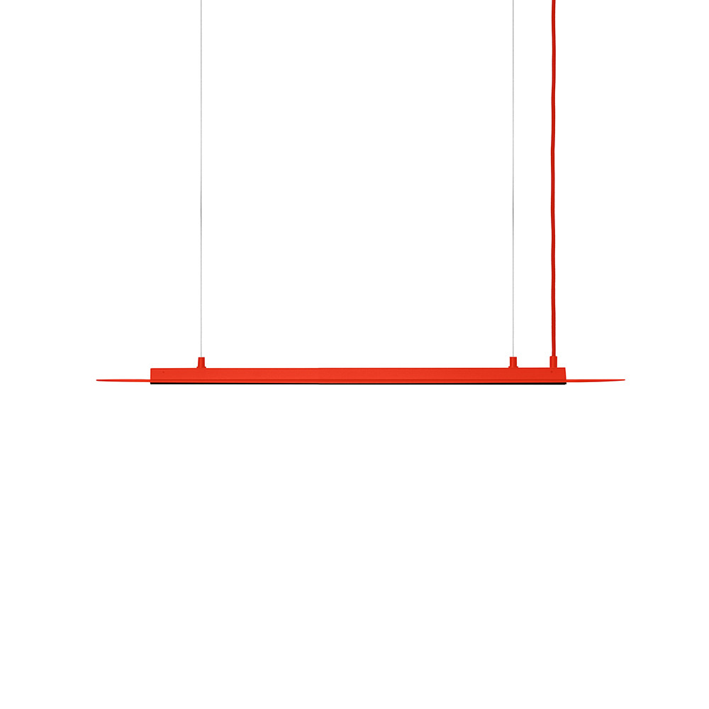 - plafonnier, lampe suspendue - couleur rouge-orange (Vermillon RAL 2002) - matériau métal - longueur 98,4cm - largeur 15,4cm - hauteur 5cm - longueur totale 150cm - câble tressé en polyester rouge-orange 180cm - 2x câble en acier 150cm - grille de plafond en métal rouge-orange 25cm x 5,8cm - LED intégrée - wattage 19,2W - IP20