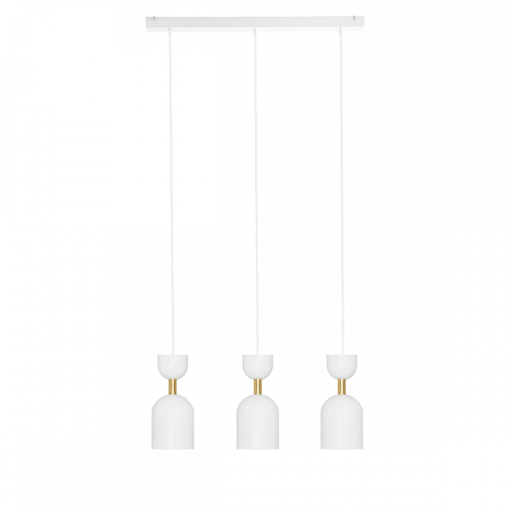 -lampe suspendue triple -métal - blanc / laiton - longueur de la lampe 130cm- largeur 60cm - 3x abat-jour en métal en blanc structurel fi 11cm - tube décoratif en laiton - garniture de plafond peinte en blanc structurel 60cm - câble bifilaire 2 X 0.75mm2 en polyester blanc tressé 100cm de long - fil GU10 - max 3x10W