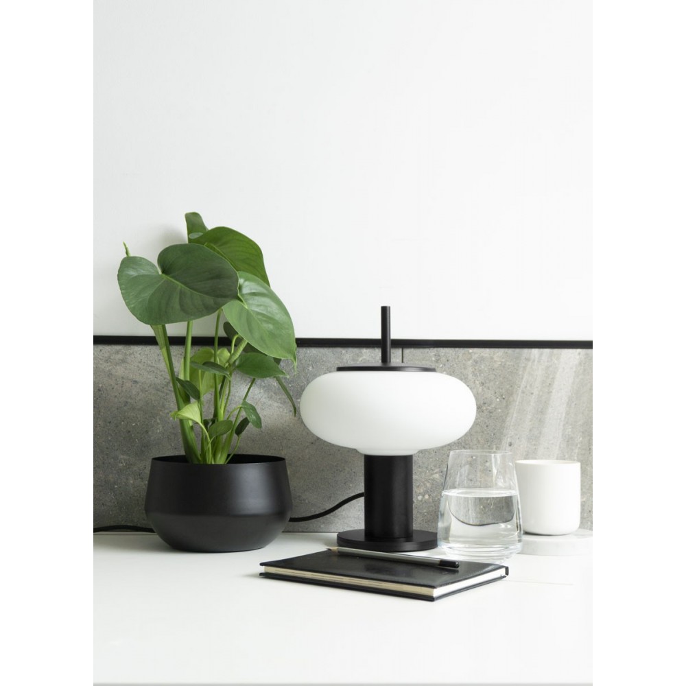 - lampe à poser - métal / verre - noir / blanc - hauteur 28,5 cm - diamètre 22 cm - diffuseur en verre blanc dépoli fi 22 cm - base structurelle laquée noire fi 12 cm - 2 X 0.75mm2 câble bifilaire en tresse polyester noire - longueur 150 cm - prise et interrupteur noirs - filetage E27 - max 15W
