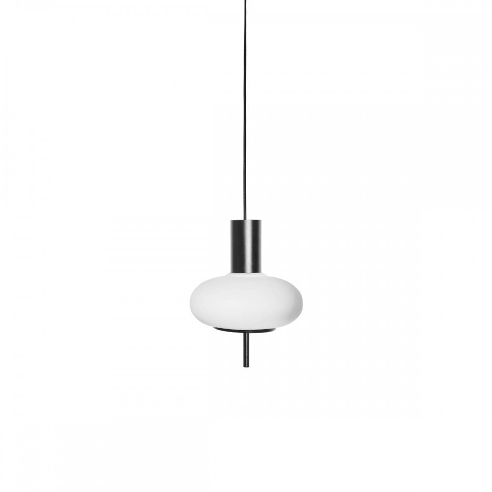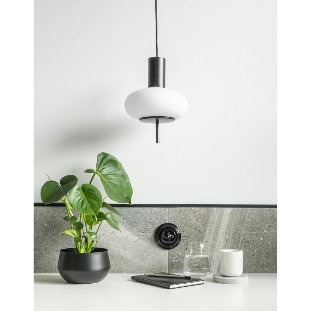 - plafonnier / suspension - métal / verre - noir / blanc - longueur totale 130cm - diamètre 22cm - diffuseur en verre blanc mat fi 22cm - cadre structurel laqué noir fi 12cm - câble bifilaire 2 X 0.75mm2 en tresse polyester noire - longueur 100cm - filetage E27 - max 15W